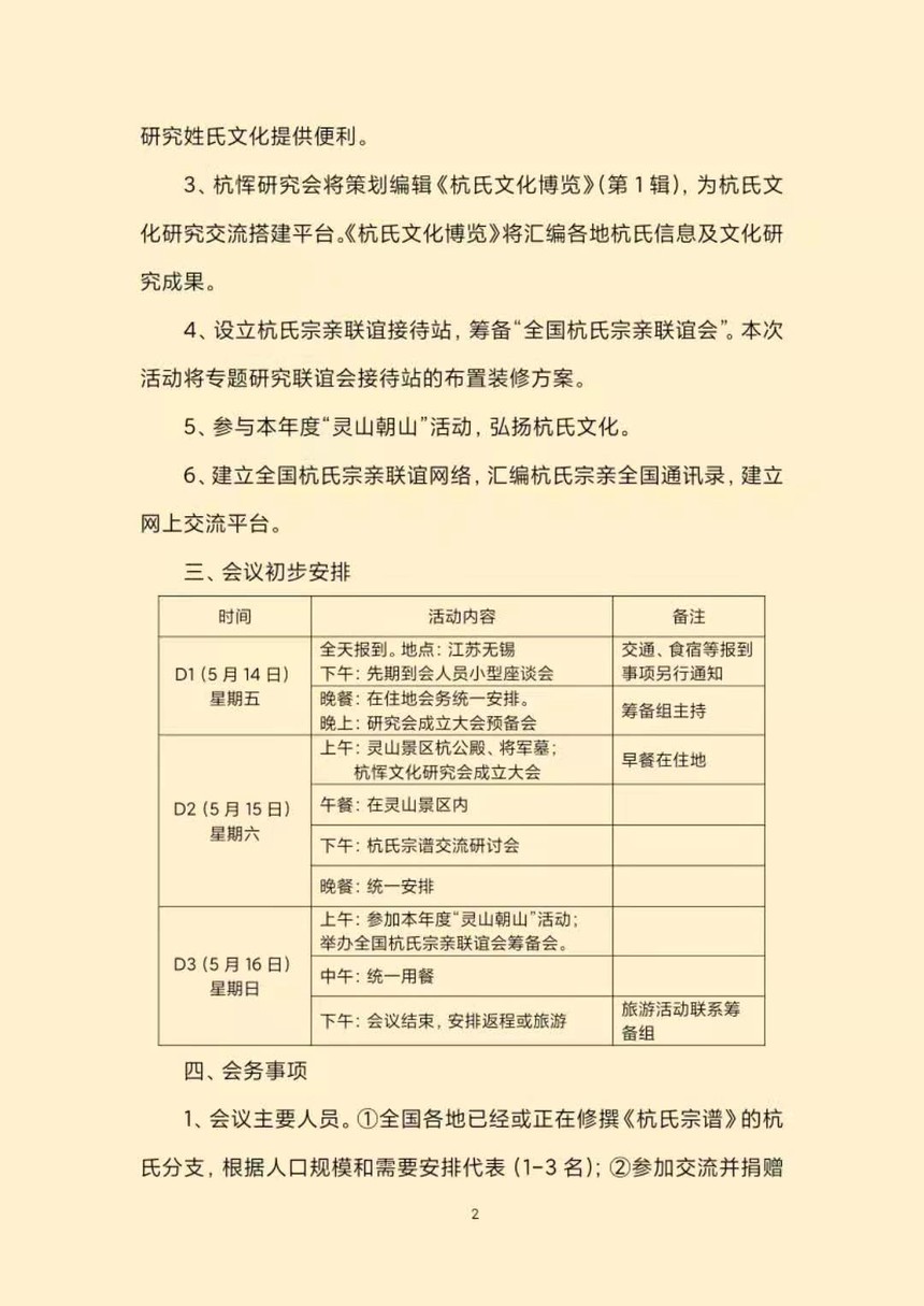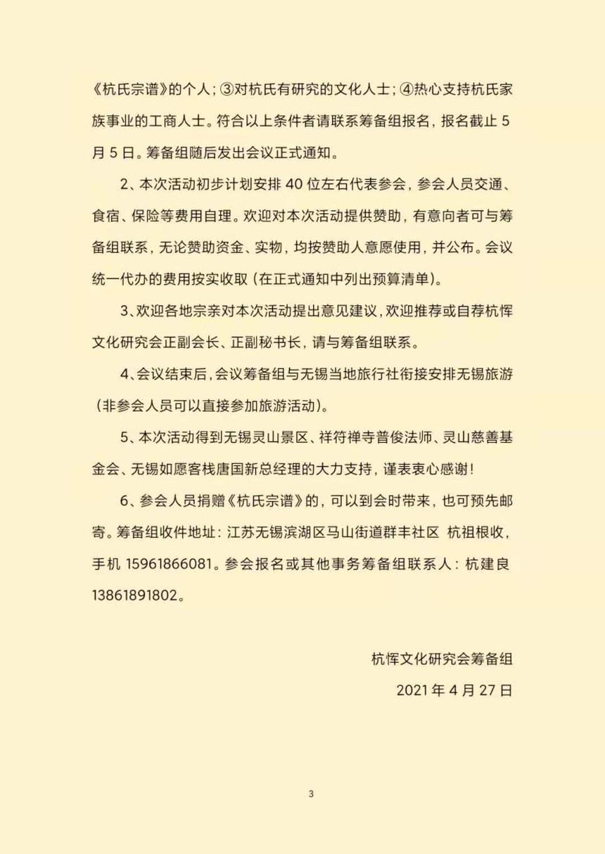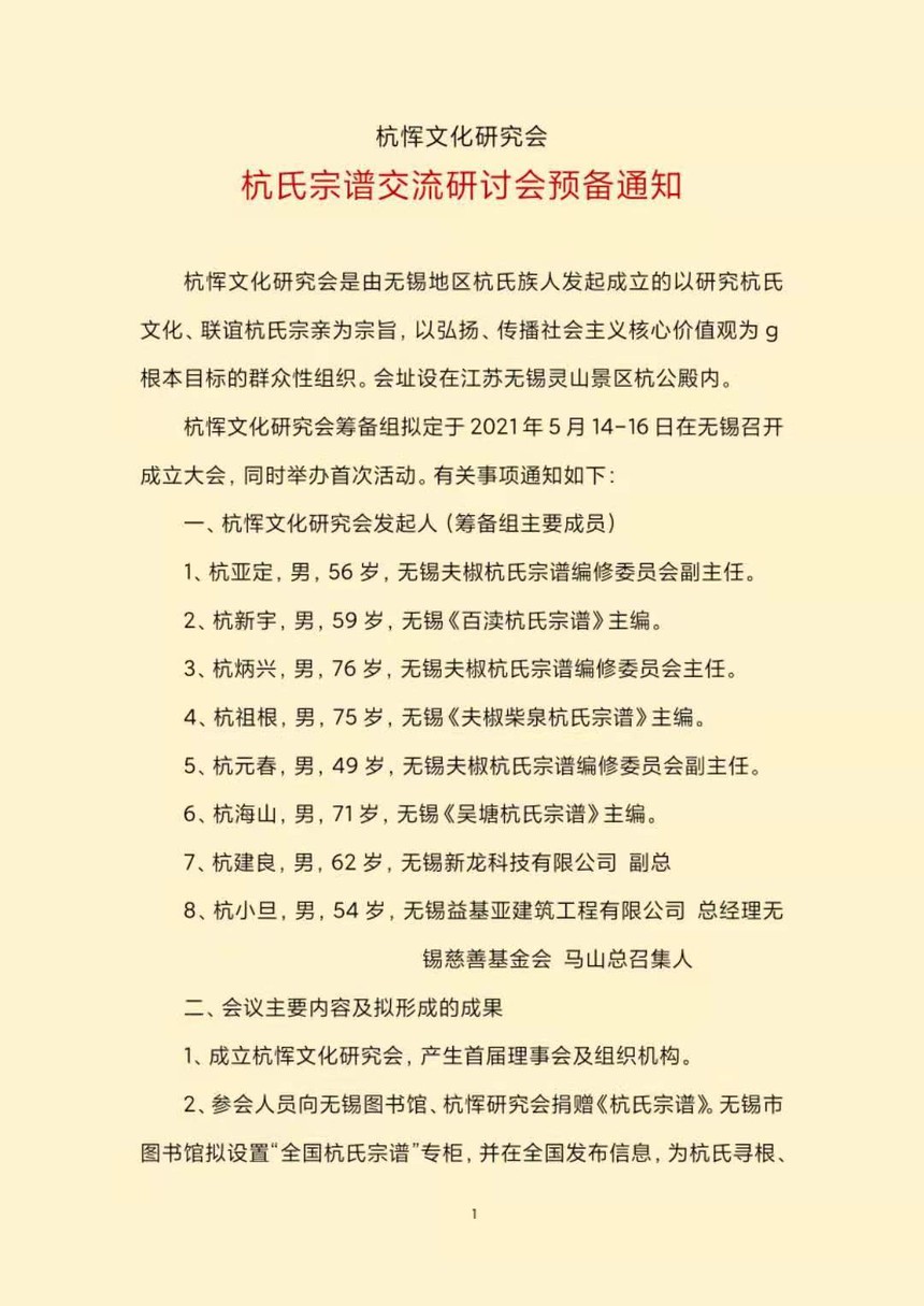 杭恽文化研究会是由无锡地区杭氏族人发起成立的以研究杭氏文化、联谊杭氏宗亲为宗旨,以弘扬、传播社会主义核心价值观为根本目标的群众性组织。会址设在江苏无锡灵山景区杭公殿内。 杭恽文化研究会筹备组定于2021年5月14-16日在无锡召开成立大会暨杭氏宗谱交流研讨会。 会议主要内容: 1、成立杭恽文化研究会,产生首届理事会及组织机构。 2、参会人员向无锡图书馆、杭恽研究会捐赠《杭氏宗谱》。无锡市图书馆拟设置“全国杭氏宗谱”专柜,并在全国发布信息,为杭氏寻根、研究姓氏文化提供便利。 3、杭恽研究会将策划编辑《杭氏文化博览》(第1辑),为杭氏文化研究交流搭建平台。《杭氏文化博览》将汇编各地杭氏信息及文化研究成果。 4、设立杭氏宗亲联谊接待站,筹备“全国杭氏宗亲联谊会”。本次活动将专题研究联谊会接待站的布置装修方案。 5、参与本年度“灵山朝山”活动,弘扬杭氏文化。 6、建立全国杭氏宗亲联谊网络,汇编杭氏宗亲全国通讯录,建立网上交流平台。